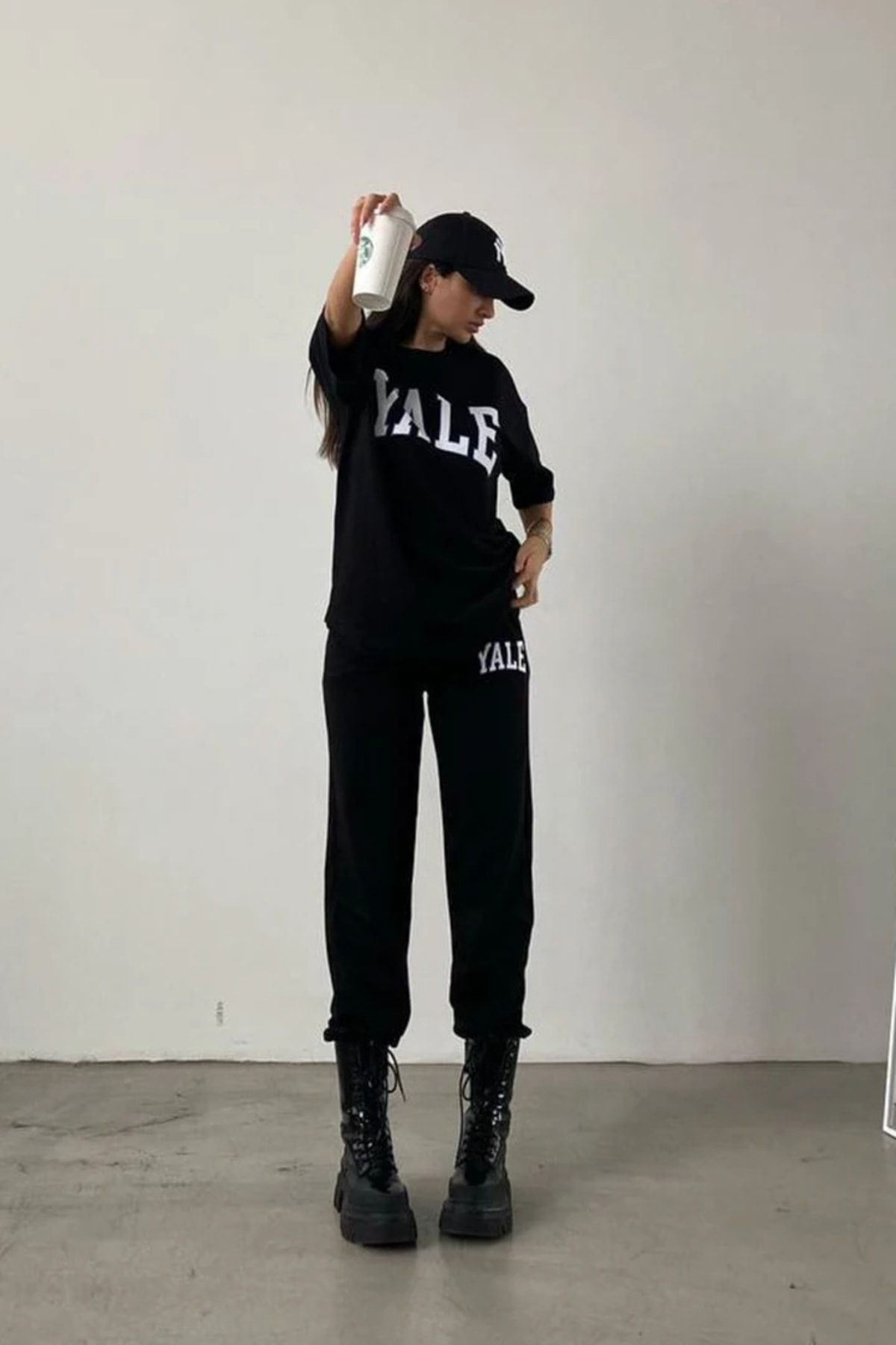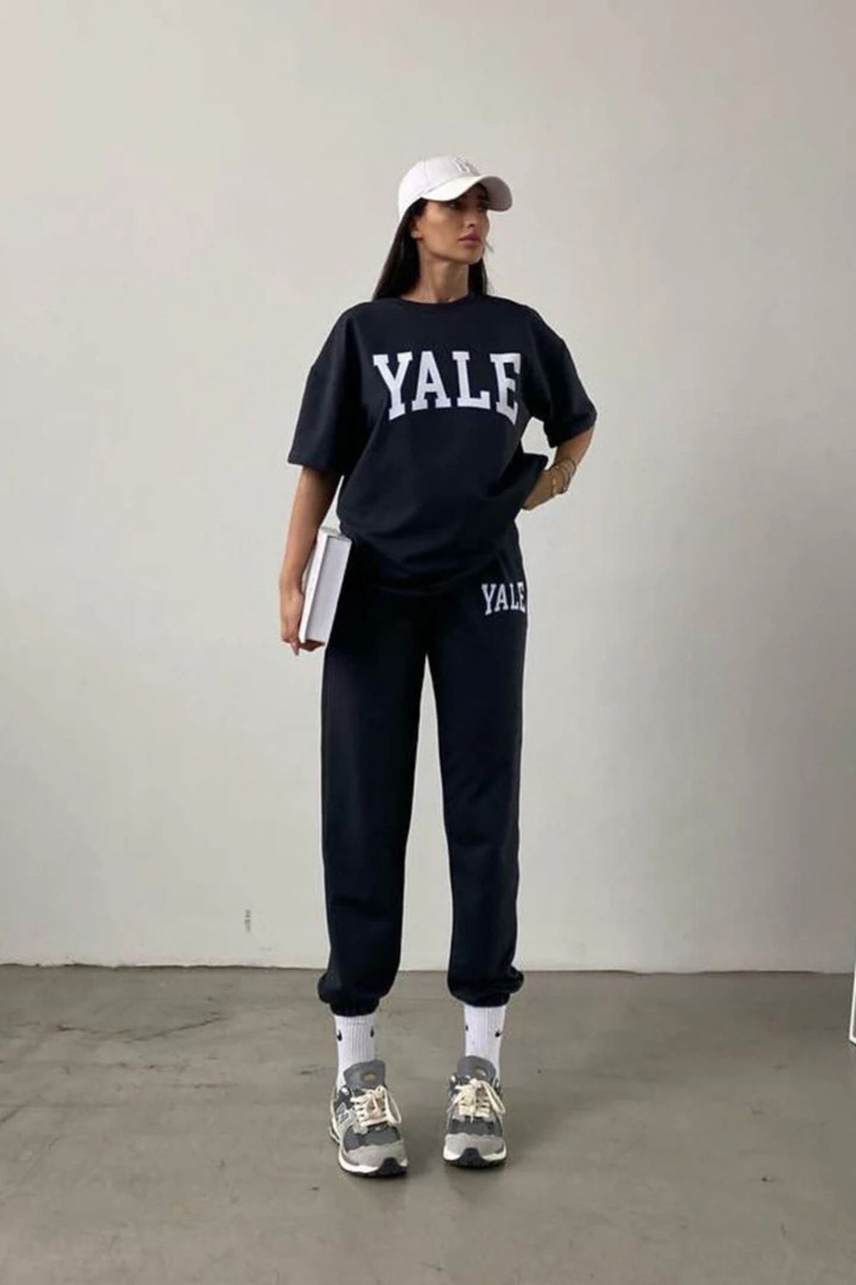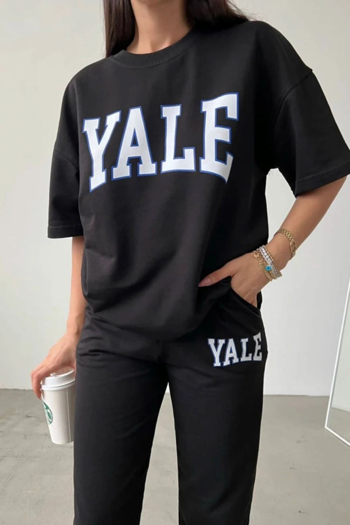 Yale Baskılı Siyah T-shirt Siyah Alt Üst Eşofman Takımı Oversize Bisiklet Yaka