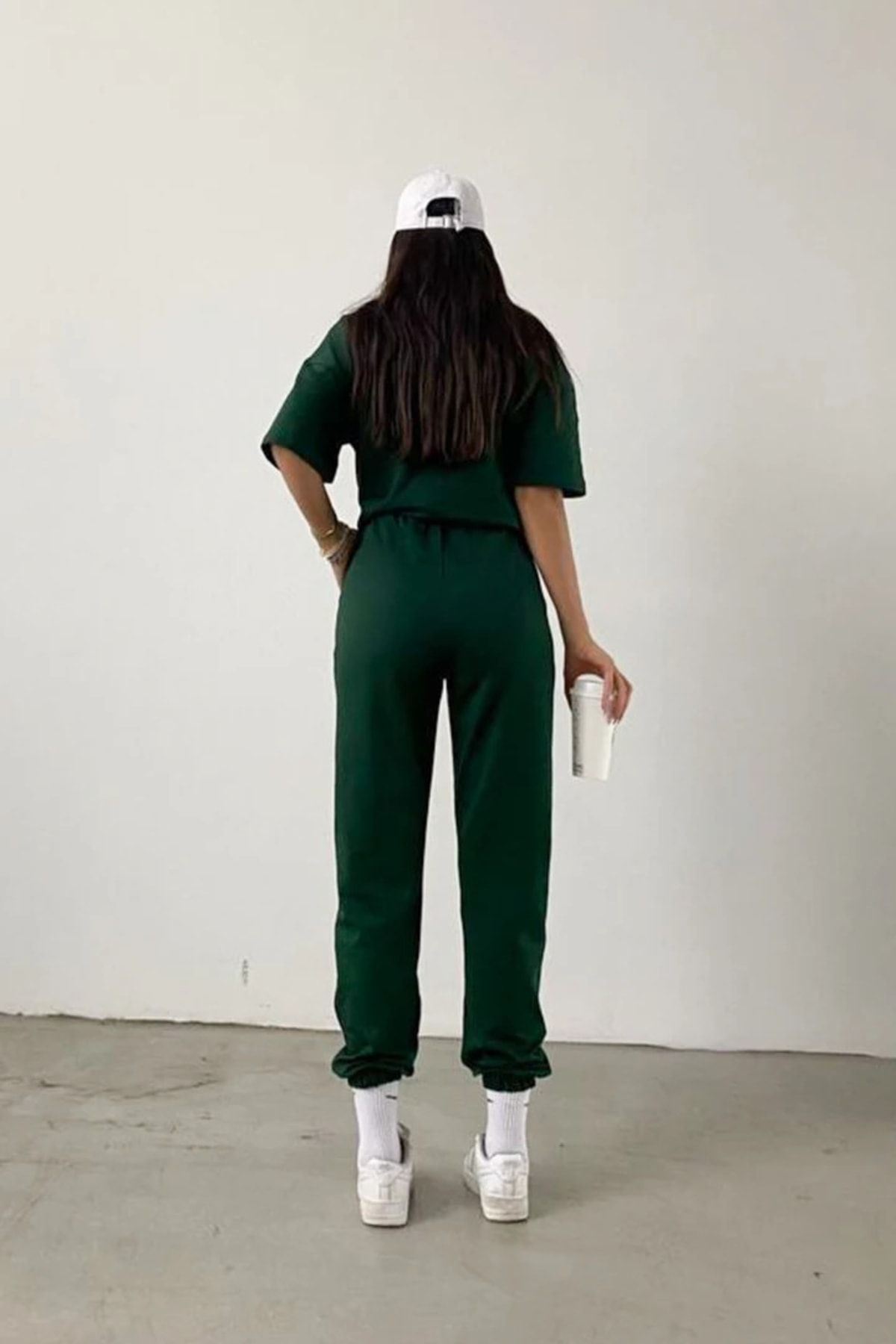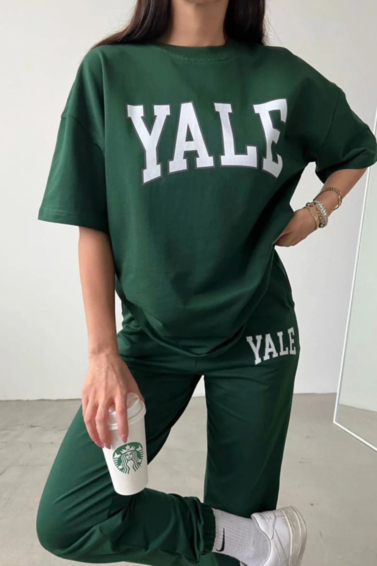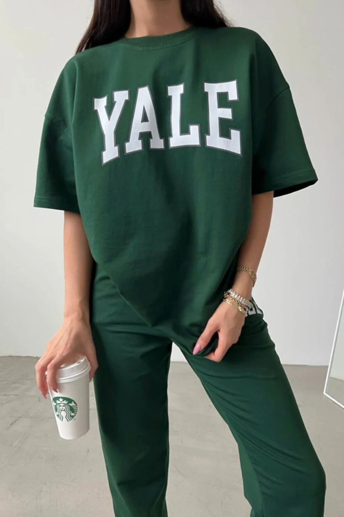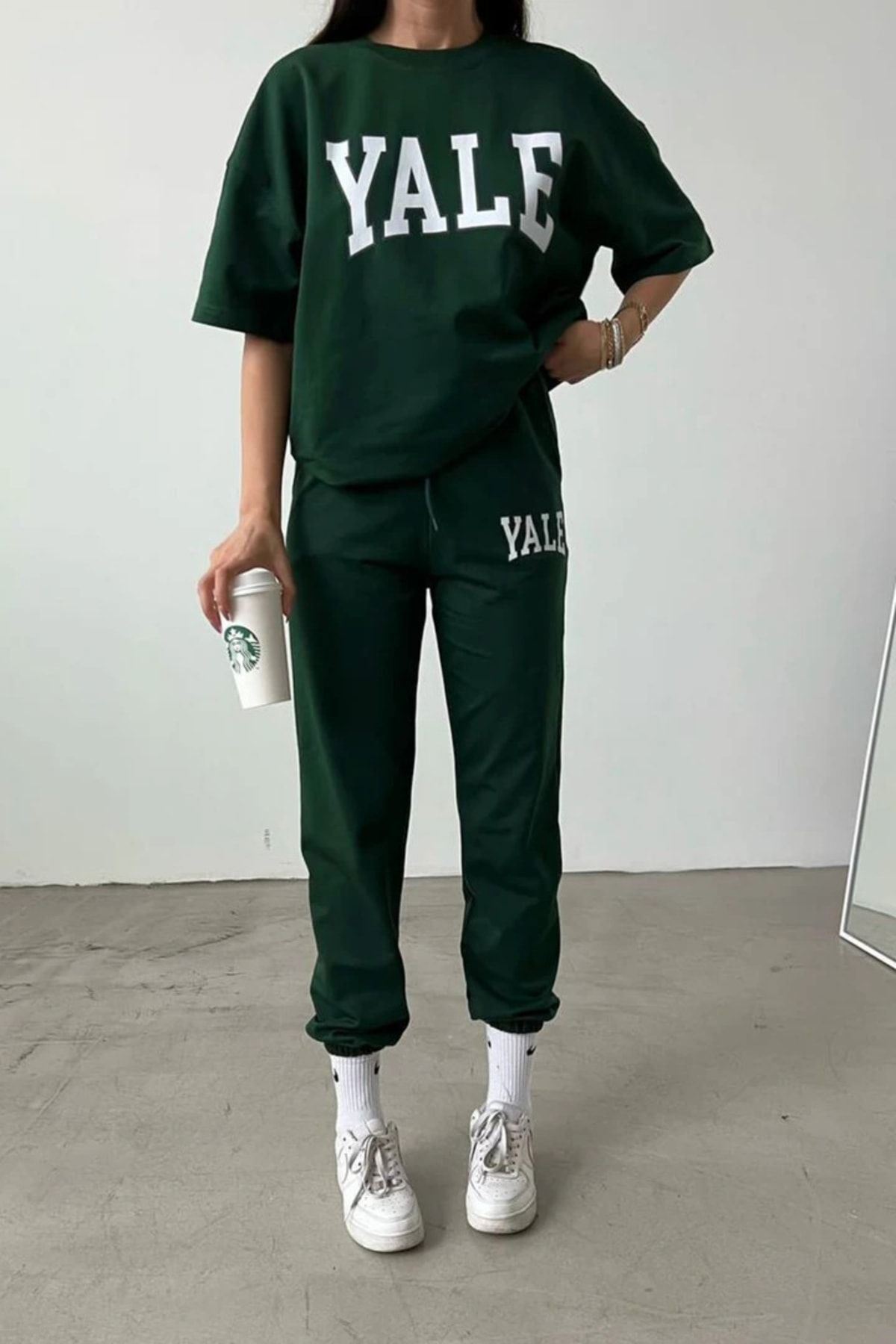 Yale T-shirt Eşofman Altı Jogger- Yeşil Baskı Alt Üst Eşofman Takımı Oversize Bisiklet Yaka