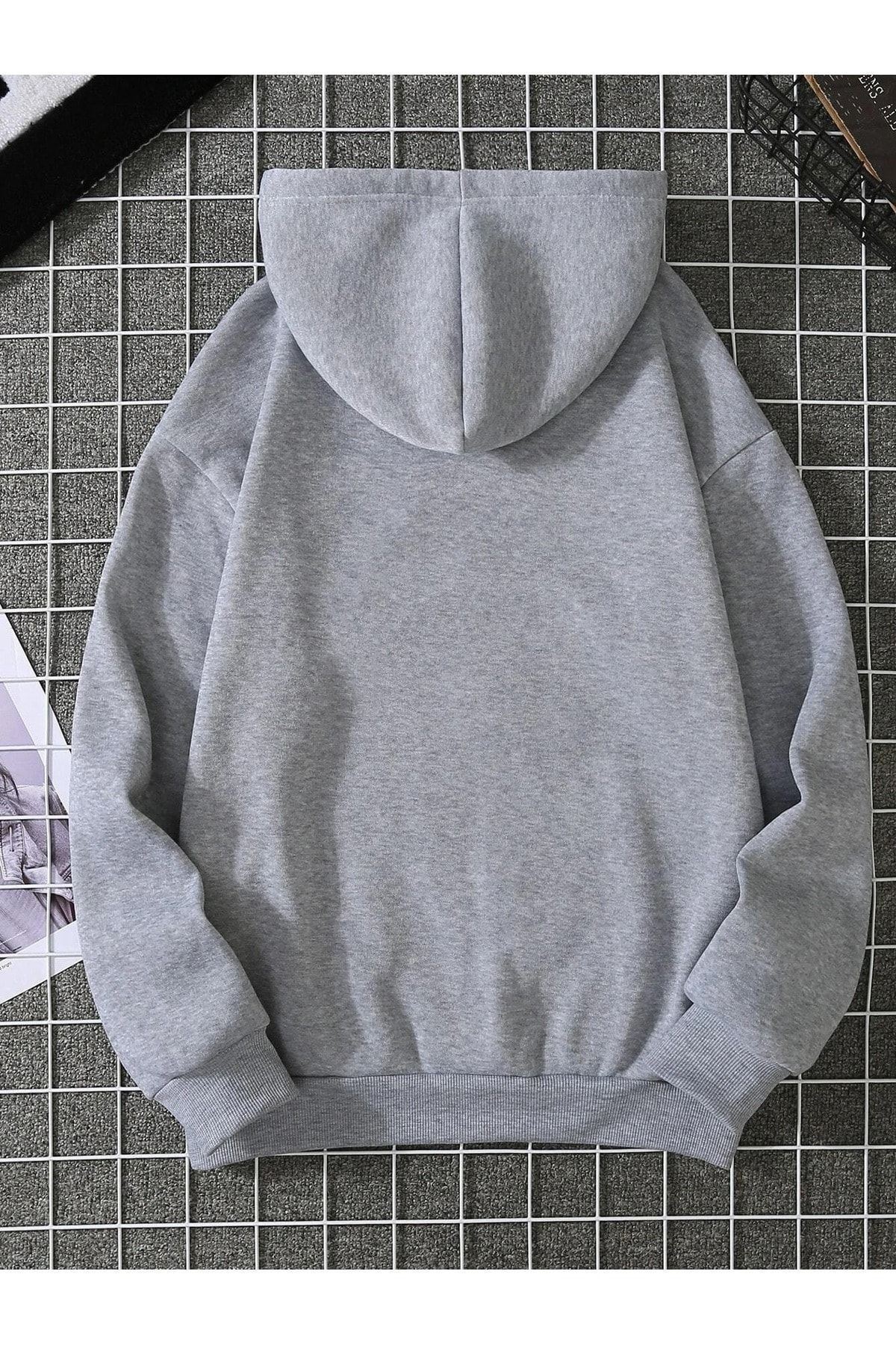 Yarım Kalp Sweatshirt - Gri Baskılı Oversize Kapüşonlu