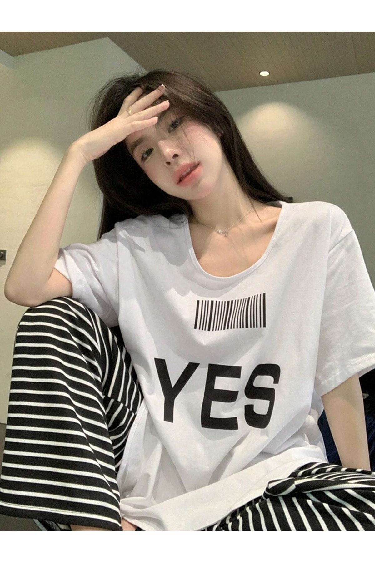 Yes Barkod T-Shirt - Beyaz Baskılı Oversize Bisiklet Yaka Kısa Kol