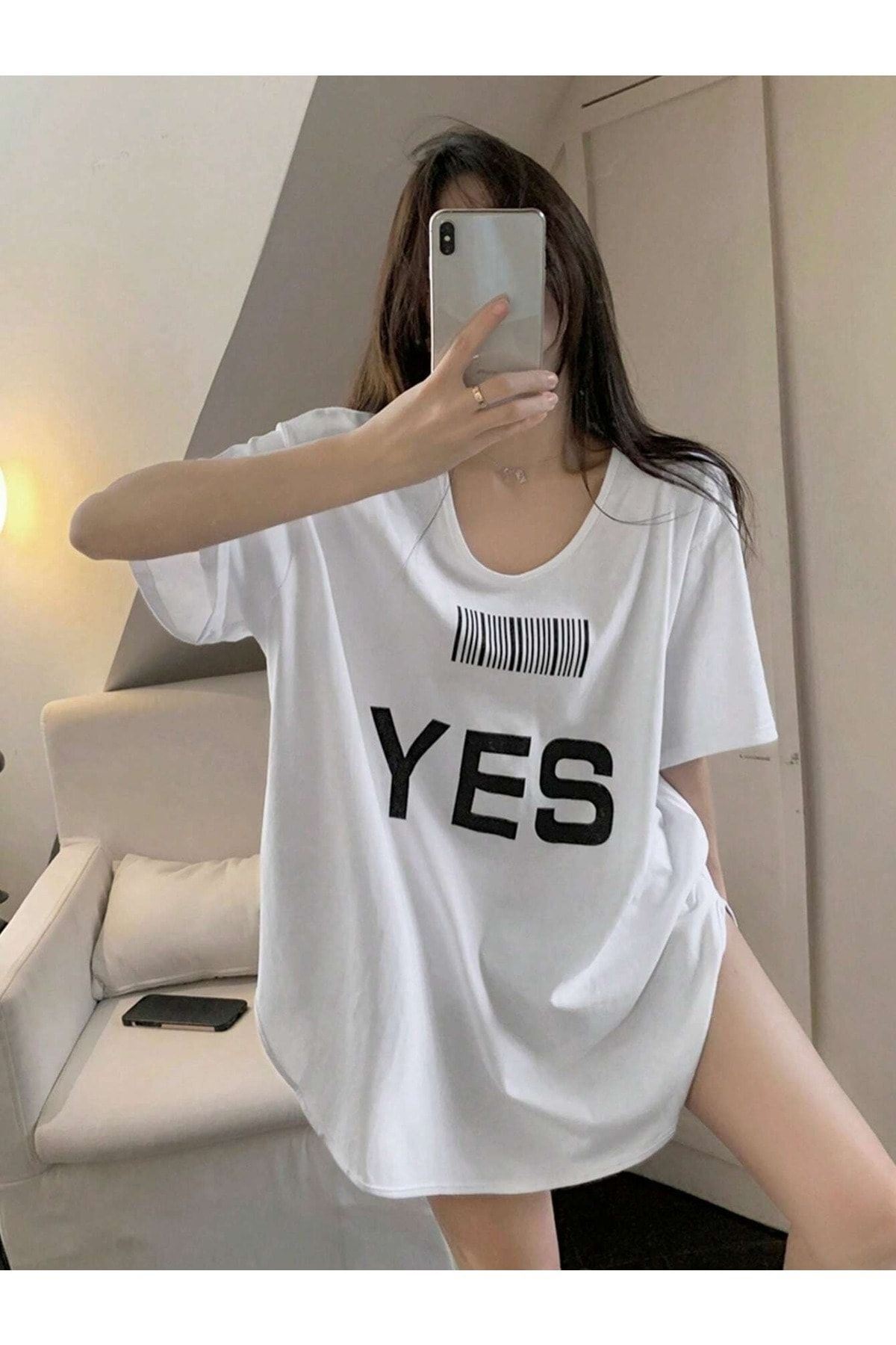 Yes Barkod T-Shirt - Beyaz Baskılı Oversize Bisiklet Yaka Kısa Kol